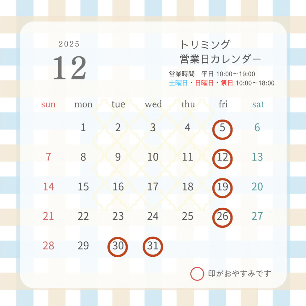 臨時休業日:12/30(火)・12/31(水)・1/1(木)・1/2(金)、1/3(土)